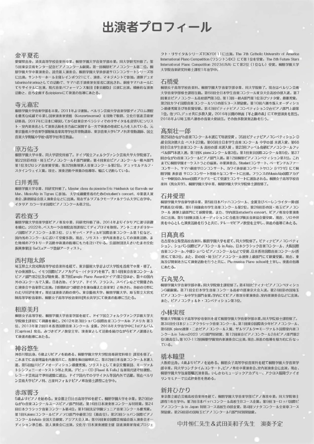中井恒仁先生&武田美和子先生門下のコンサートを下記のとおり開催いたします。